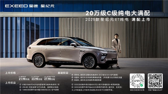 3月18日,“油电同智 全球同行”奇瑞汽车智能化战略发布会在芜湖盛大召开。在这场“智能化”盛宴上,2025款星纪元ET纯电满配上市,共推出Pro城市智驾、Max城市智驾、Ultra四驱城市智驾三款配置版型,官方指导价为21.98万元-27.98万元。新车以全系标配猎鹰智驾700、8295P芯片等五大满配实力强势杀入20万级市场,成为该价格区间内唯一覆盖C级尺寸、城市智驾、超长续航与豪华驾控的纯电车型,重新定义C级SUV价值标杆,开创智驾比新时代!